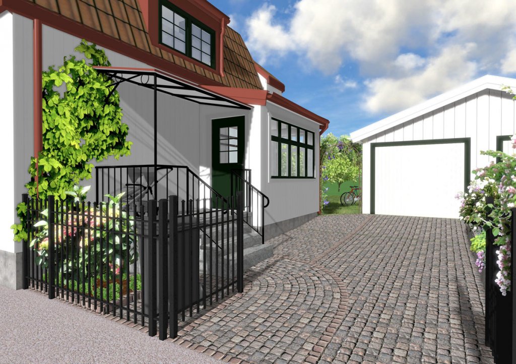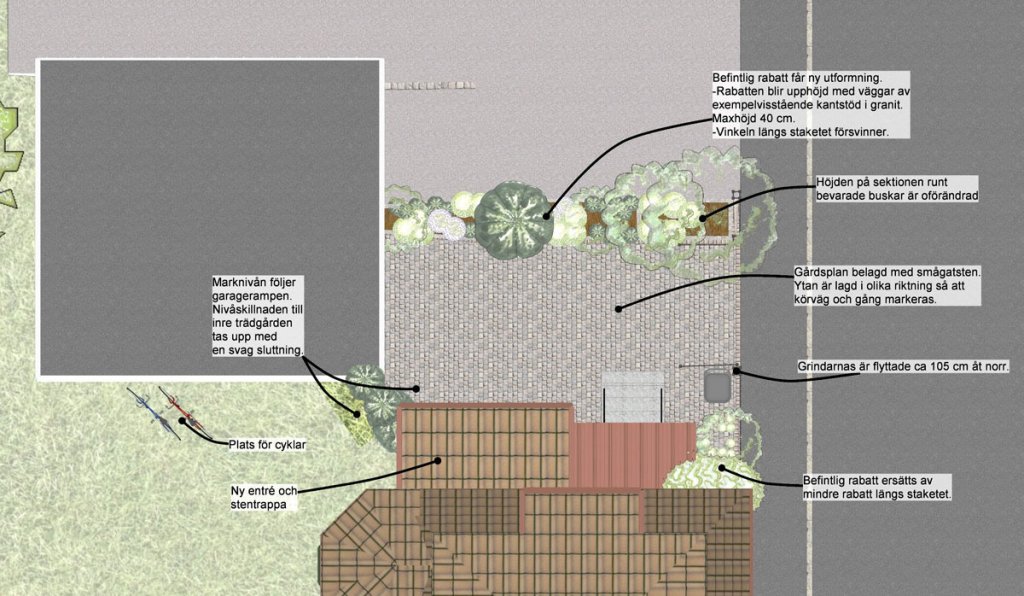 Ett lite äldre parhus i stadsmiljö behöver en ny och större entré för en av bostäderna. I samband den nya entrén utvecklas också entrésituationen utomhus. Ett förslag på ny rabatt mot grannen samt utvecklad gårdsplan tas fram.