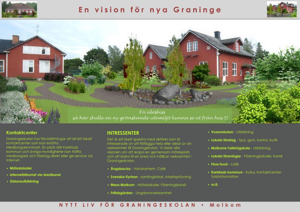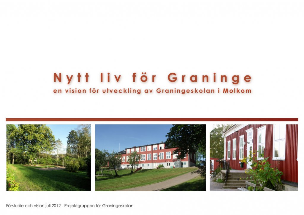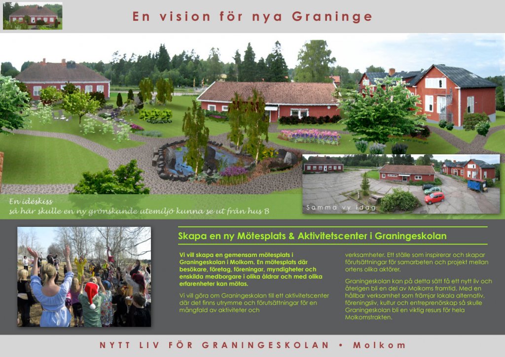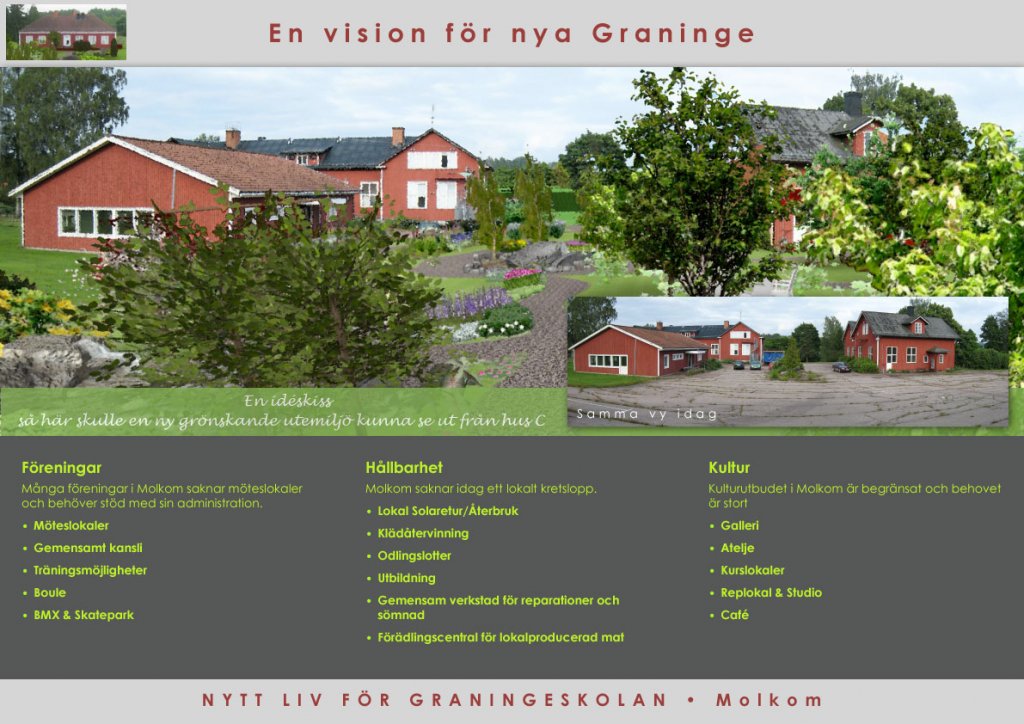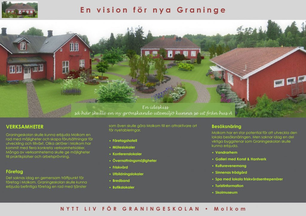 Den gamla Graningeskolan i Molkom har stått tom i flera år. Föreningar och lokala organisationer vill skapa en mötesplats, ett kulturhus och ett allaktivitetshus i den vackra gamla skolan. Ett första visionsdokument tas fram som underlag för samtal med kommunen och tänkbara brukare. Ny grönskande utemiljö istället för asfalterad gård lyfts fram som visuell tankeväckare.