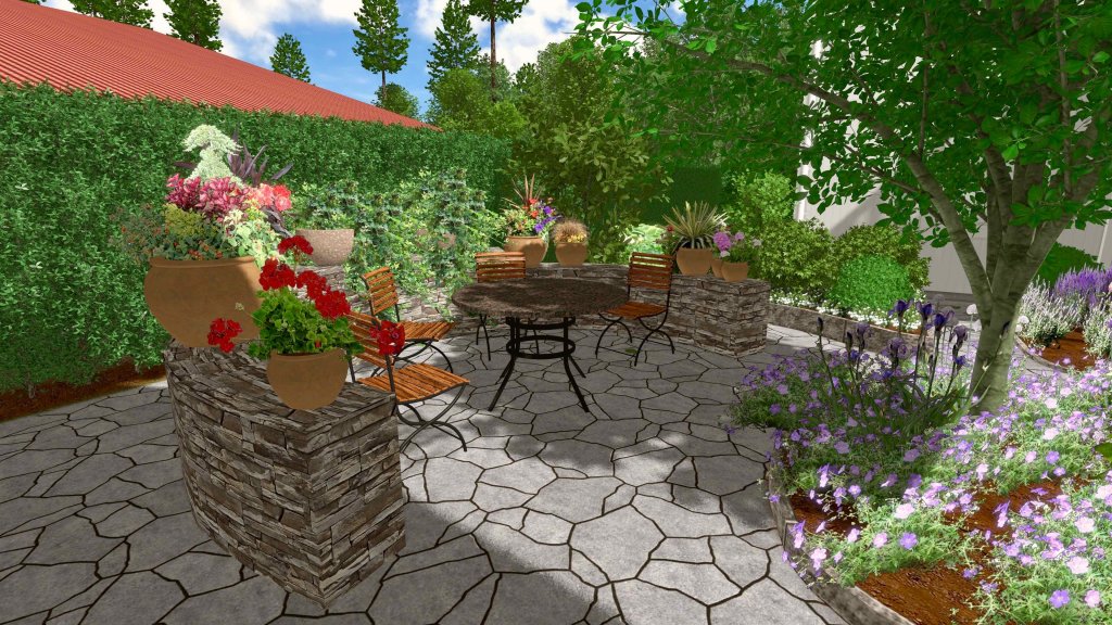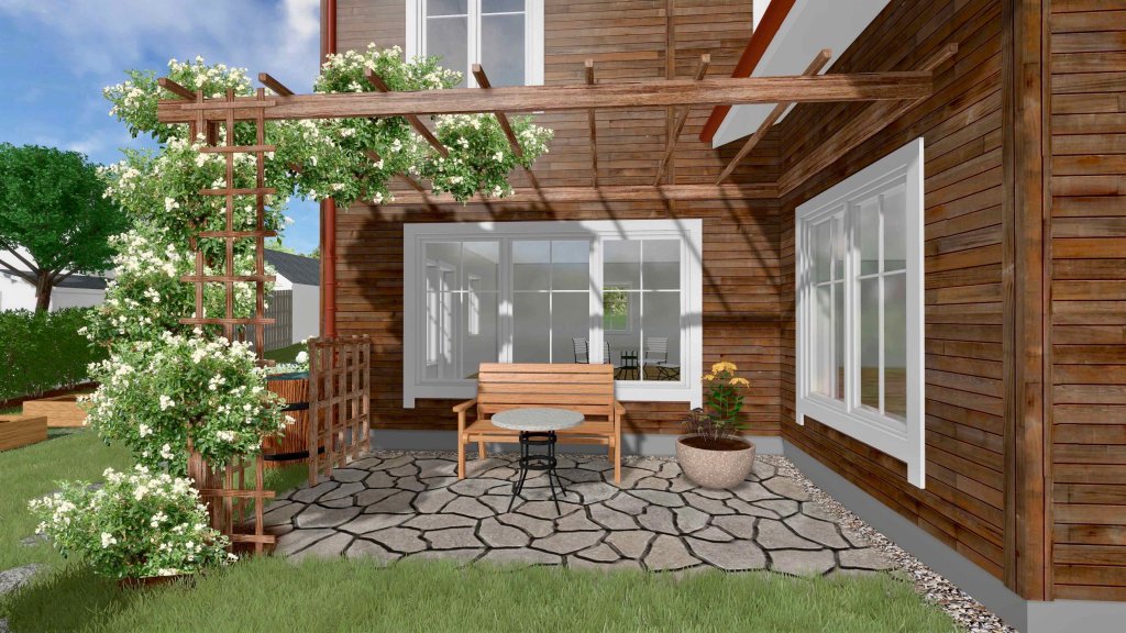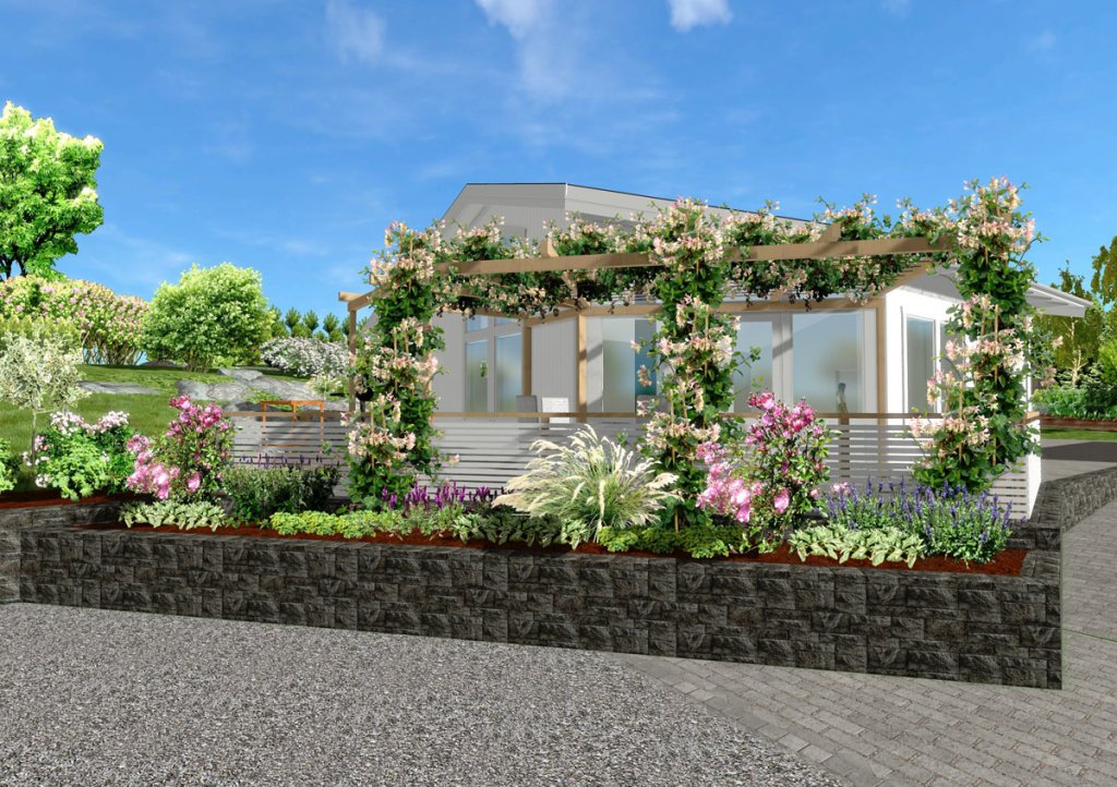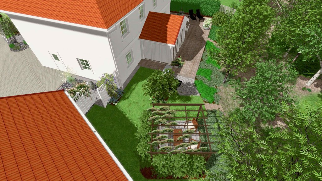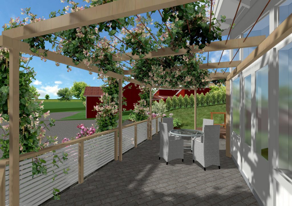 En fristående villa behövde utveckling av oskyddad altan i söder. En ny pergola ger insynsskydd och solskydd och upphöjda bäddar med planteringar mot gatan ger också skydd och avskildhet.