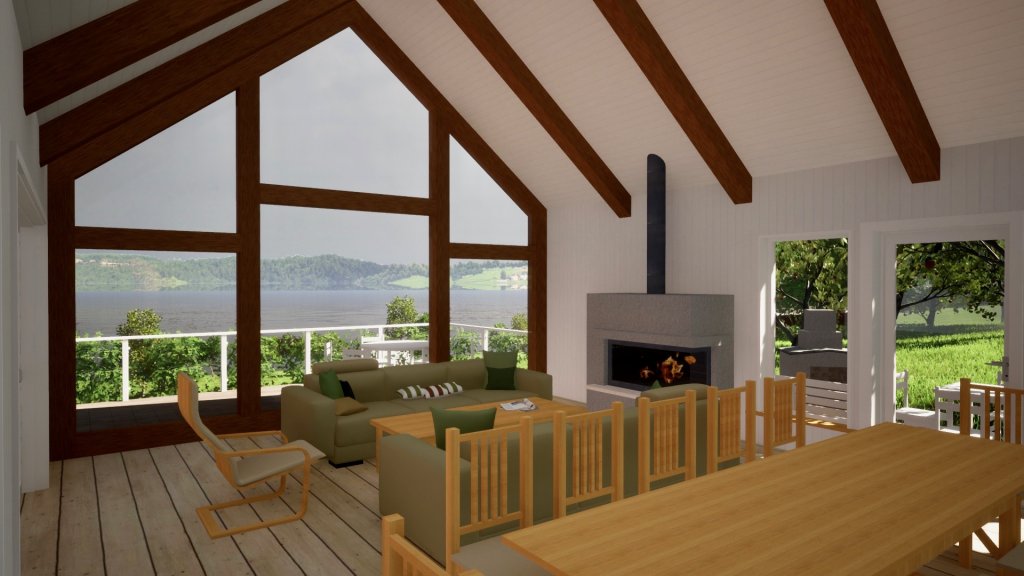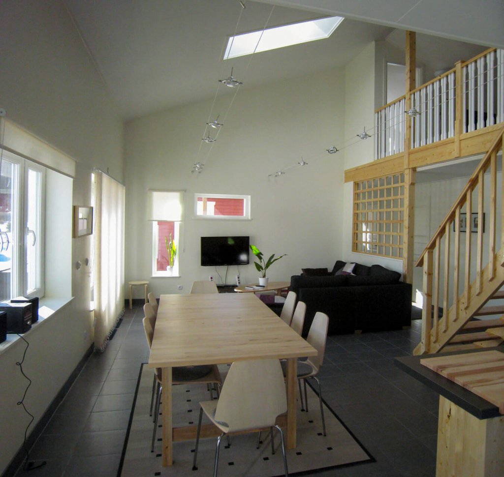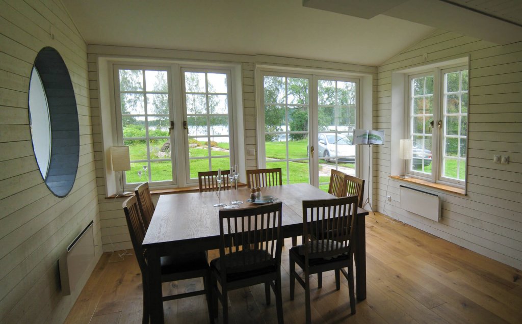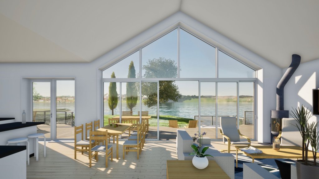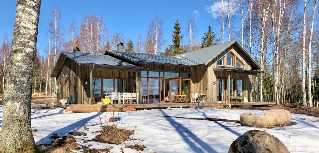 Nybyggnation av enfamiljshus vid Vänern. Ett plan i mer publika delar, ett och ett halvt plan med loft i mer privat del.
