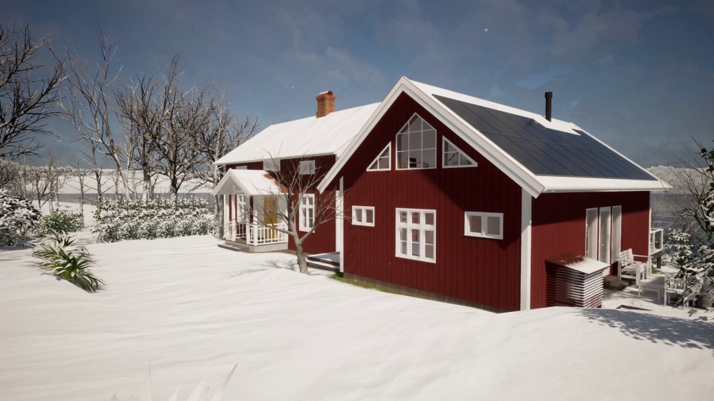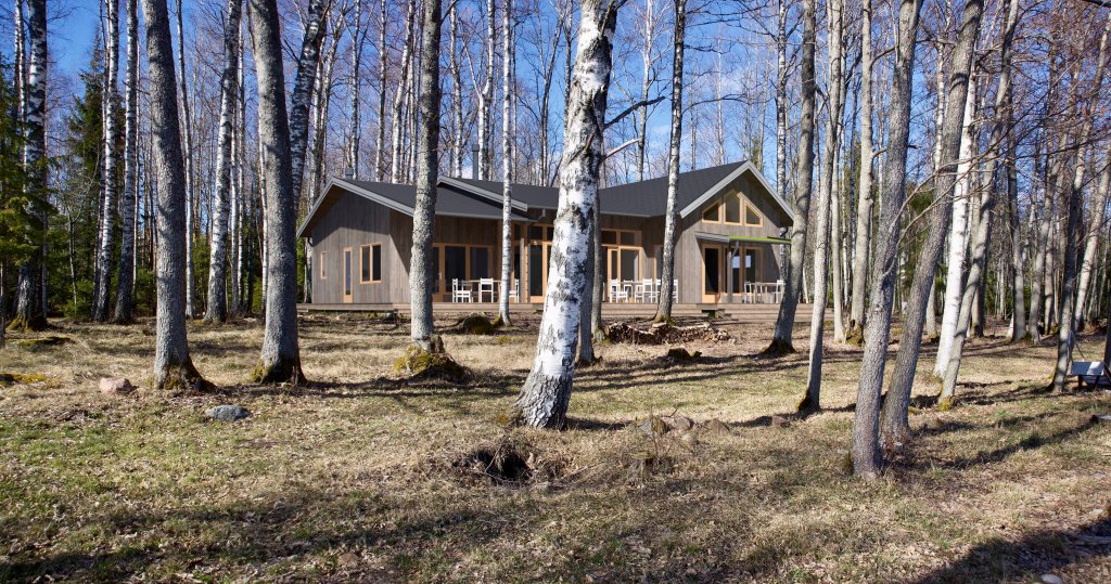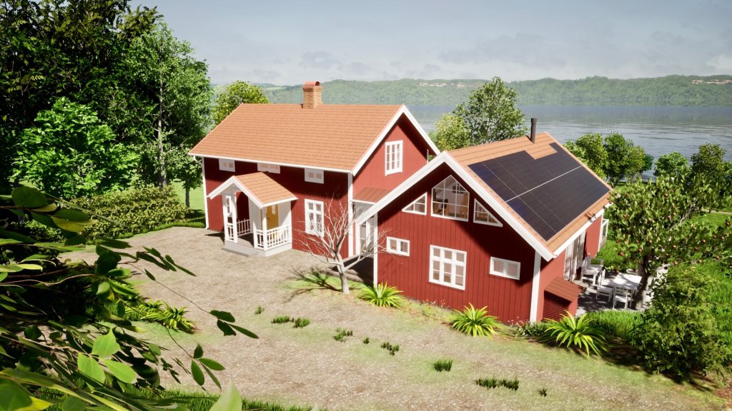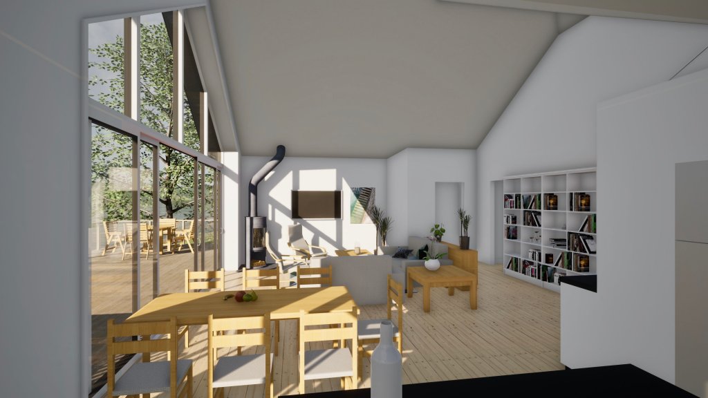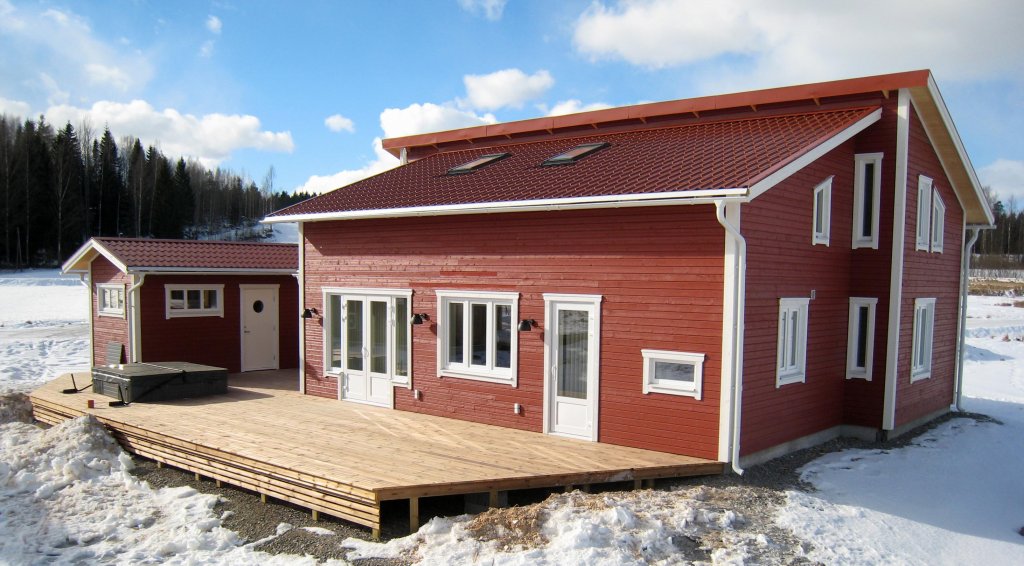 Nybyggnation av enfamiljshus vid Vänern. Ett plan i mer publika delar, ett och ett halvt plan med loft i mer privat del.