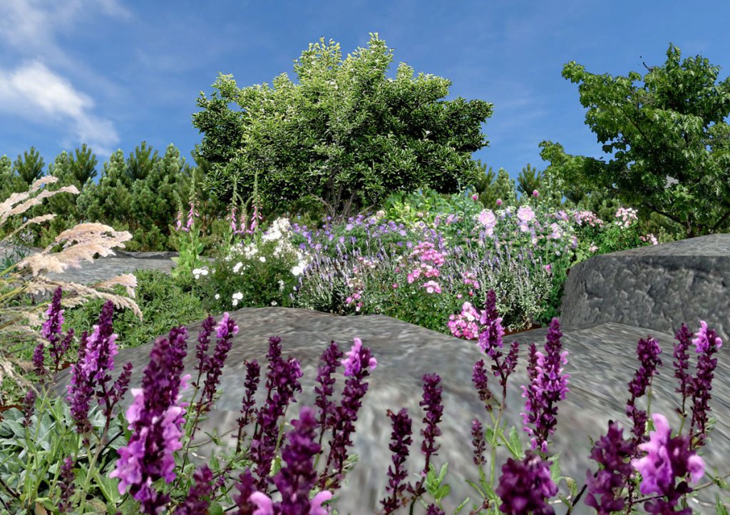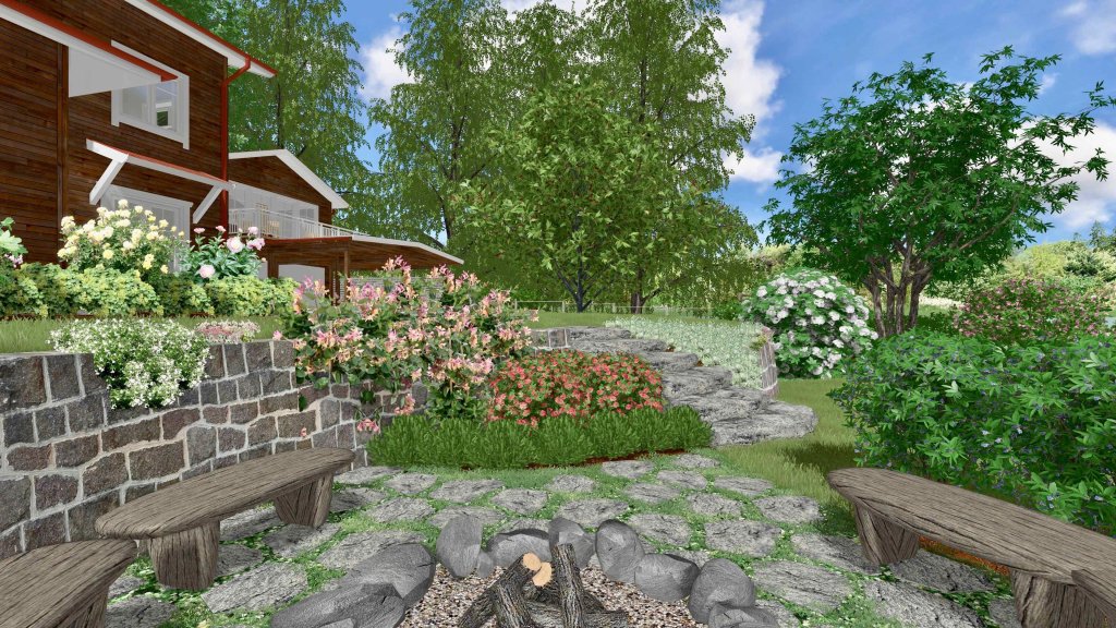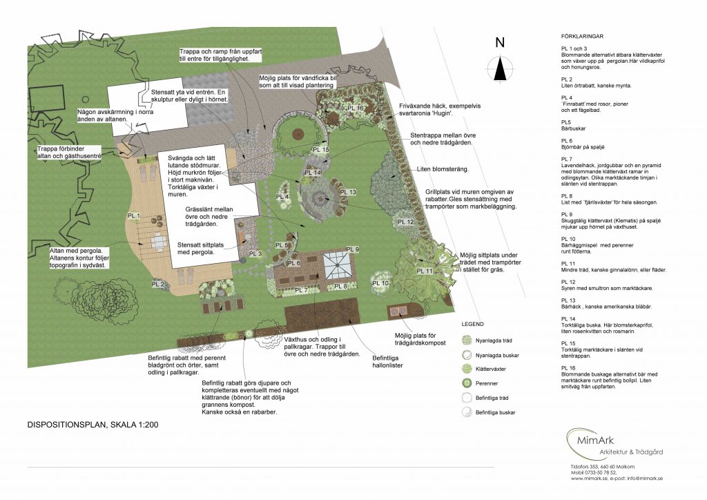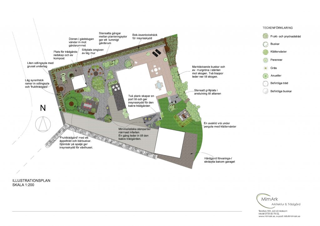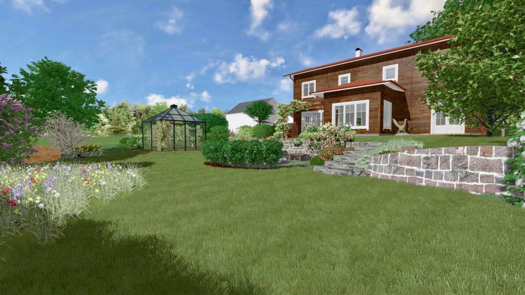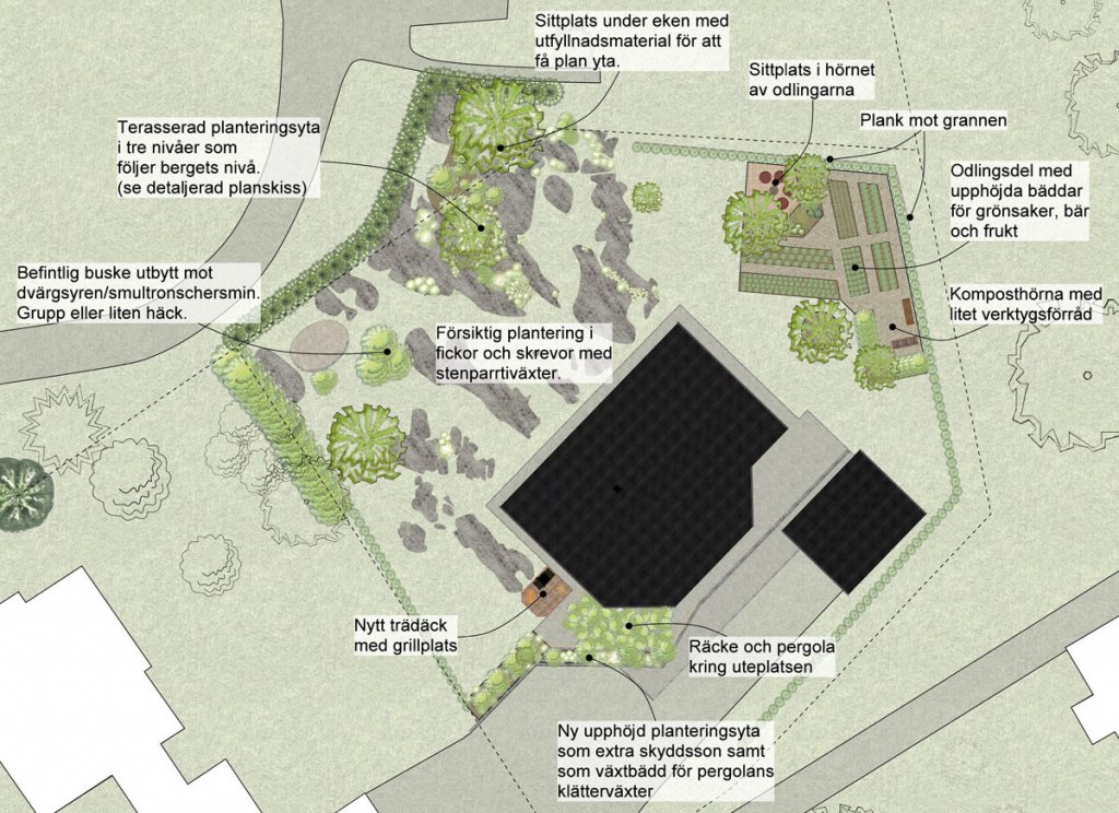 Tomten är en kuperad naturtomt med berg i dagen. Här ges förslag för utveckling av helheten, där karaktären av kuperad naturtomt bevaras och förstärks med inslag av örter och blommor i skrevor och stenpartier. En mer låglänt del utformas för odling.