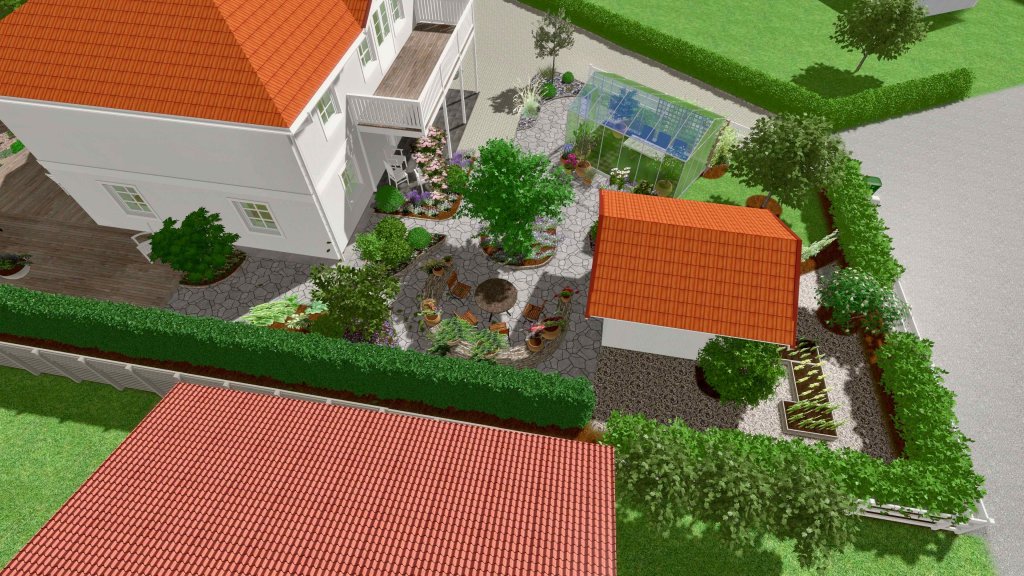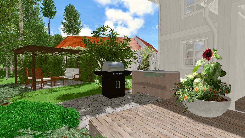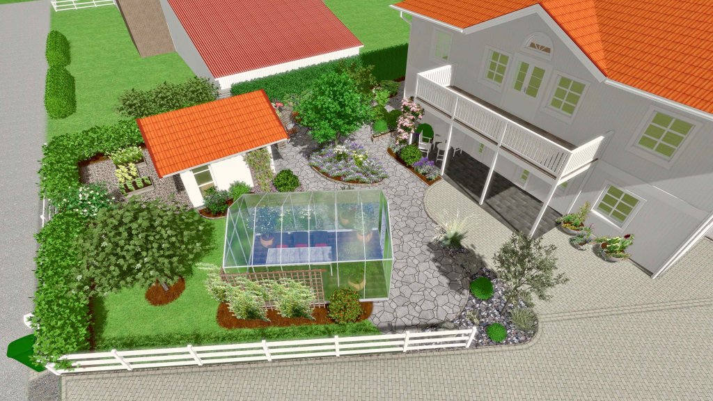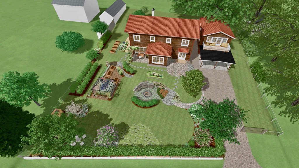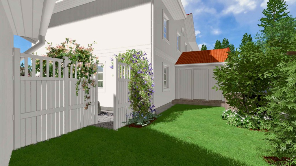 Förslag för utveckling av trädgård och utemiljö på hela tomten vid en tvåplans villa på hammarö
