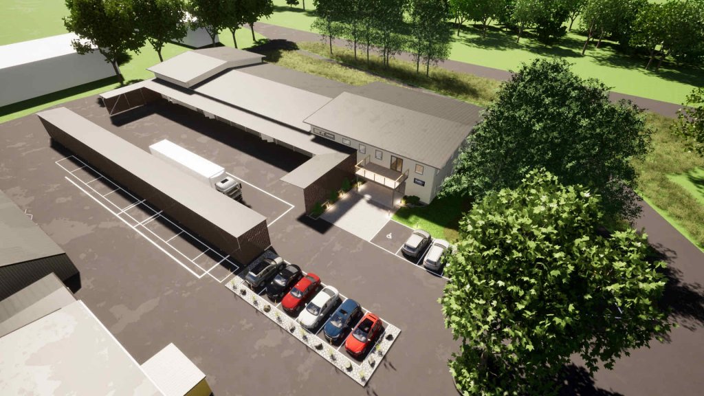 Restaurang och pizzeria i Molkom behöver växa och fräscha upp sina lokaler. Fyra förslag tas fram; från måttfull ombyggnad, större tillbyggnad och två exempel på rivning/nybyggnation. Här visas ett förslag för rivning/nybyggnation.